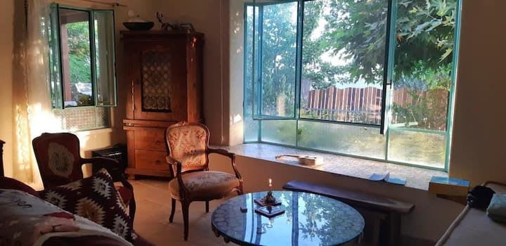 החצר היא לב החוויה הכפרית – תוכלו לשבת בפינת הישיבה הנעימה בכניסה לבית או תחת עץ רחב ידיים המעניק צל ורוגע. בגינה תמצאו בריכת דגים קסומה ולול תרנגולות קטן, כשחיות המחמד של המקום (כלב וחתול) משלימות את האווירה הביתית. במידה ותרצו להתרענן, בריכת היישוב נמצאת במרחק של דקה נסיעה או 5 דקות הליכה נעימה מהבית.